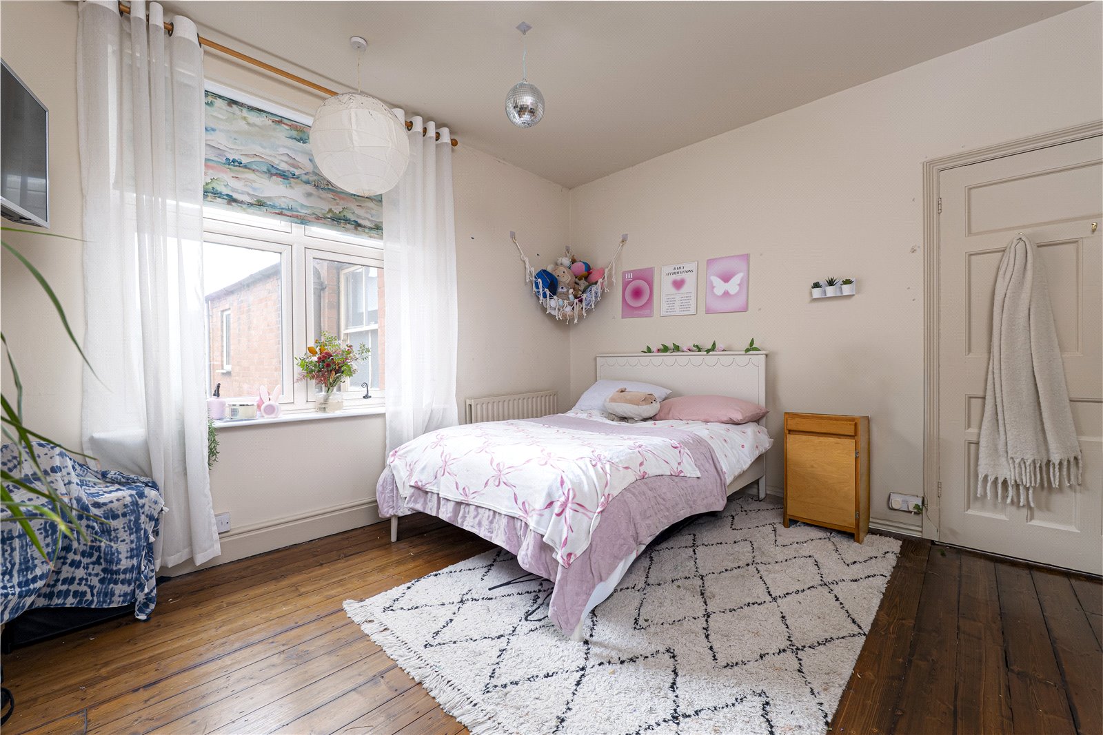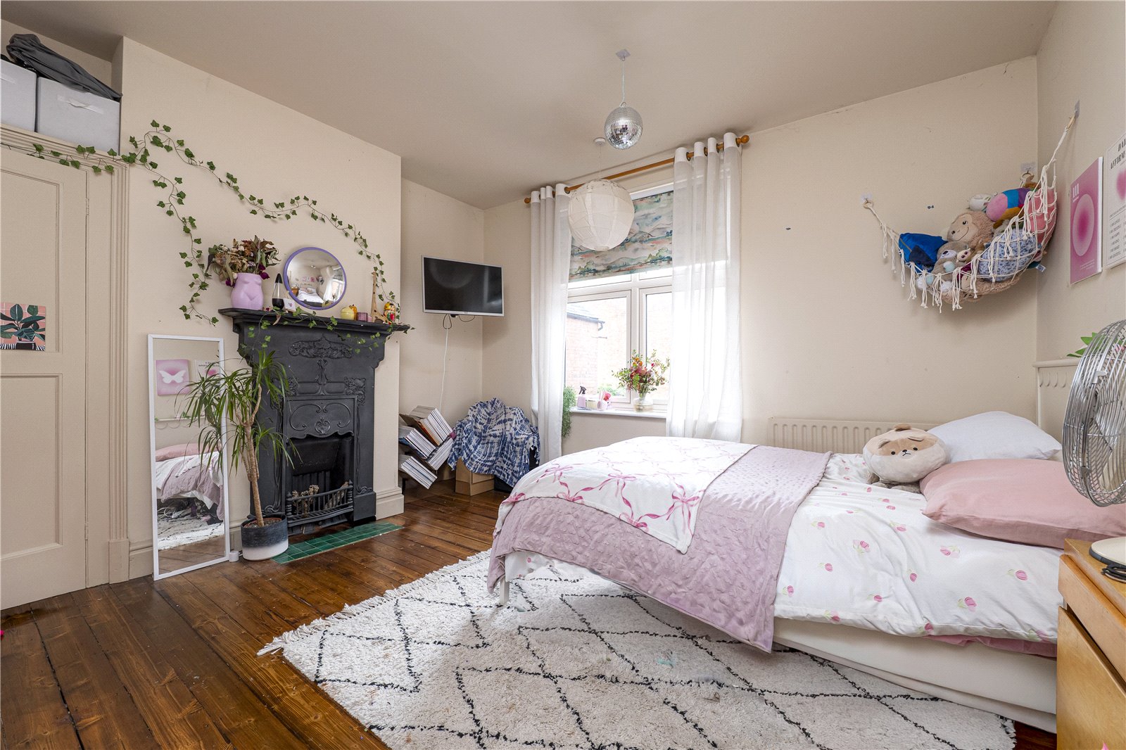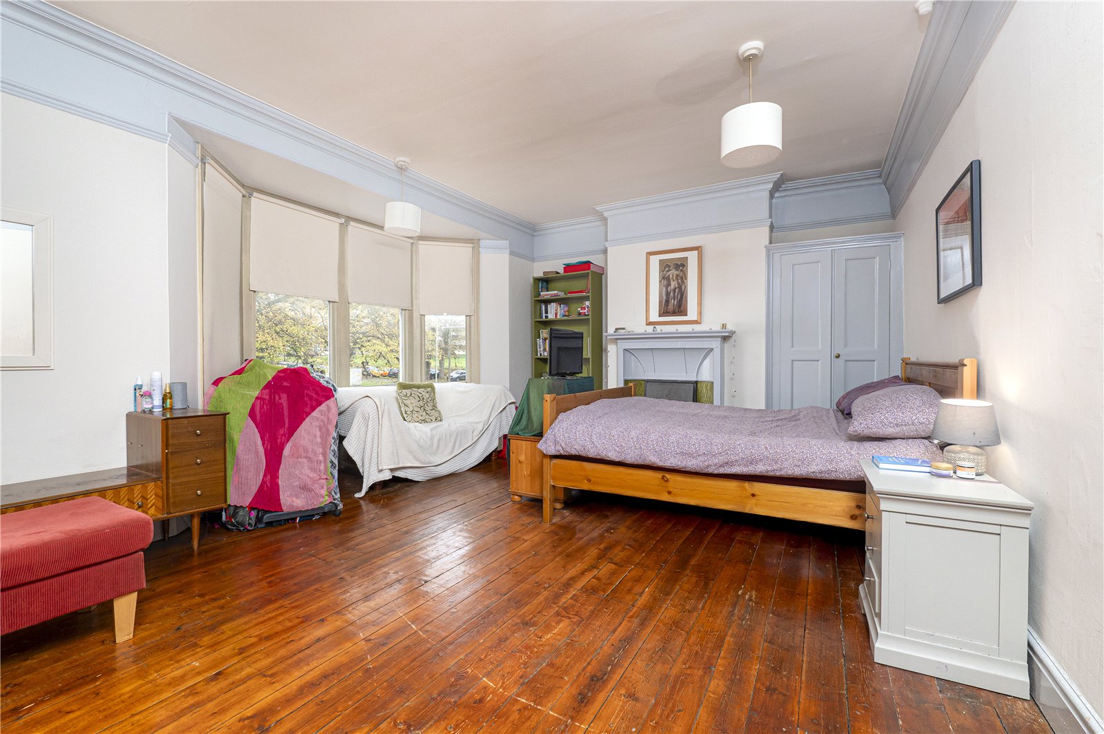 On the first floor, the main bedroom stretches across the front of the house, enjoying lovely views over Victoria Park from its large bay window. It’s a grand, elegant room with original floorboards, high ceilings and a decorative fireplace. The second bedroom, also a good double, overlooks the rear garden and has a calm, comfortable feel. Bedroom three is another well sized double and opens directly onto a private balcony — the perfect spot for a morning coffee or to enjoy the evening sun. A family bathroom and separate WC serve this floor.