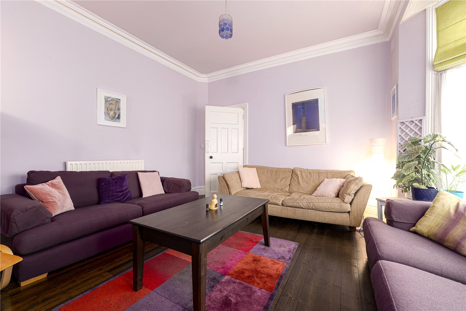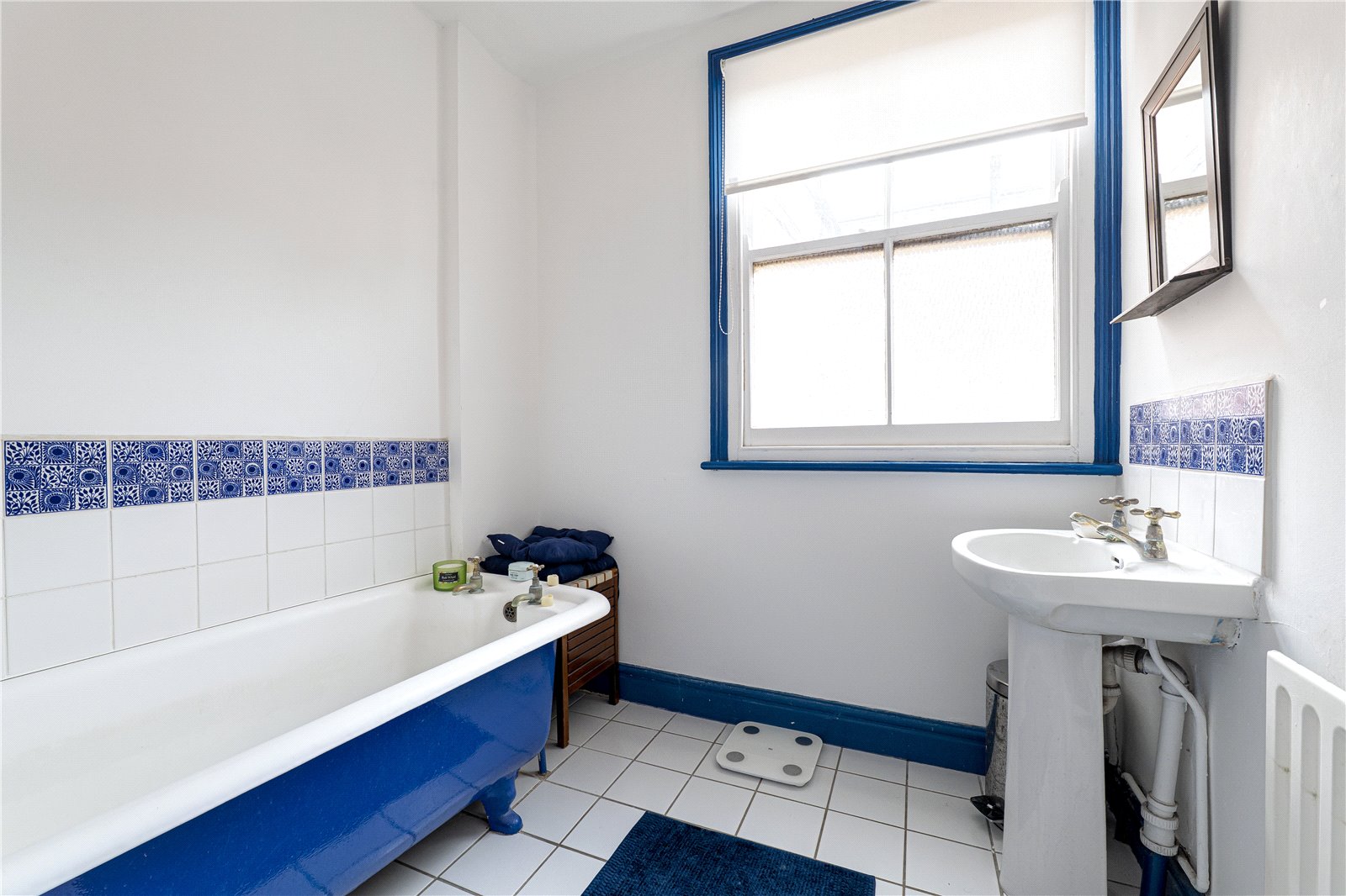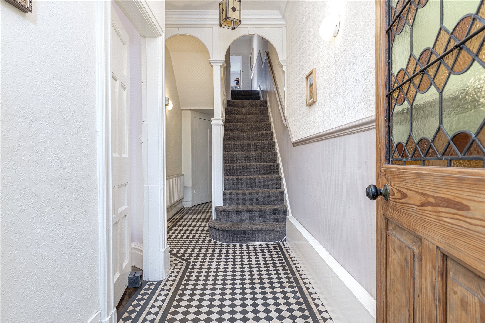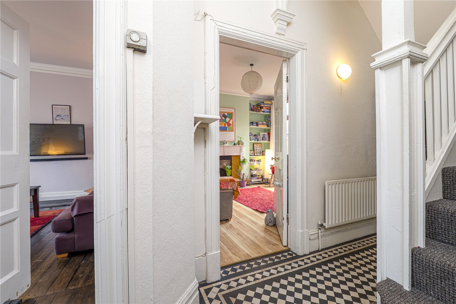 On the first floor, the main bedroom stretches across the front of the house, enjoying lovely views over Victoria Park from its large bay window. It’s a grand, elegant room with original floorboards, high ceilings and a decorative fireplace. The second bedroom, also a good double, overlooks the rear garden and has a calm, comfortable feel. Bedroom three is another well sized double and opens directly onto a private balcony — the perfect spot for a morning coffee or to enjoy the evening sun. A family bathroom and separate WC serve this floor.