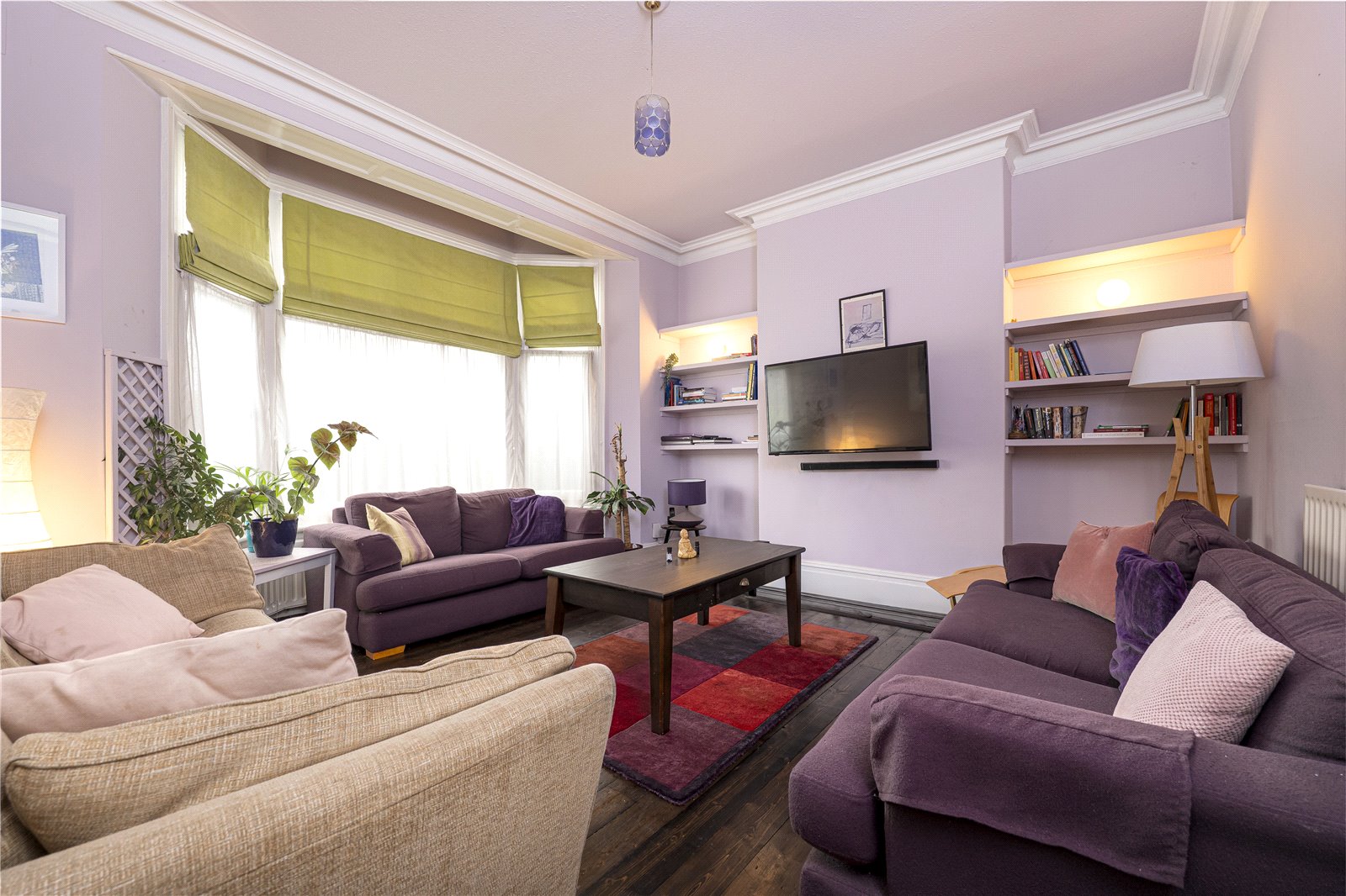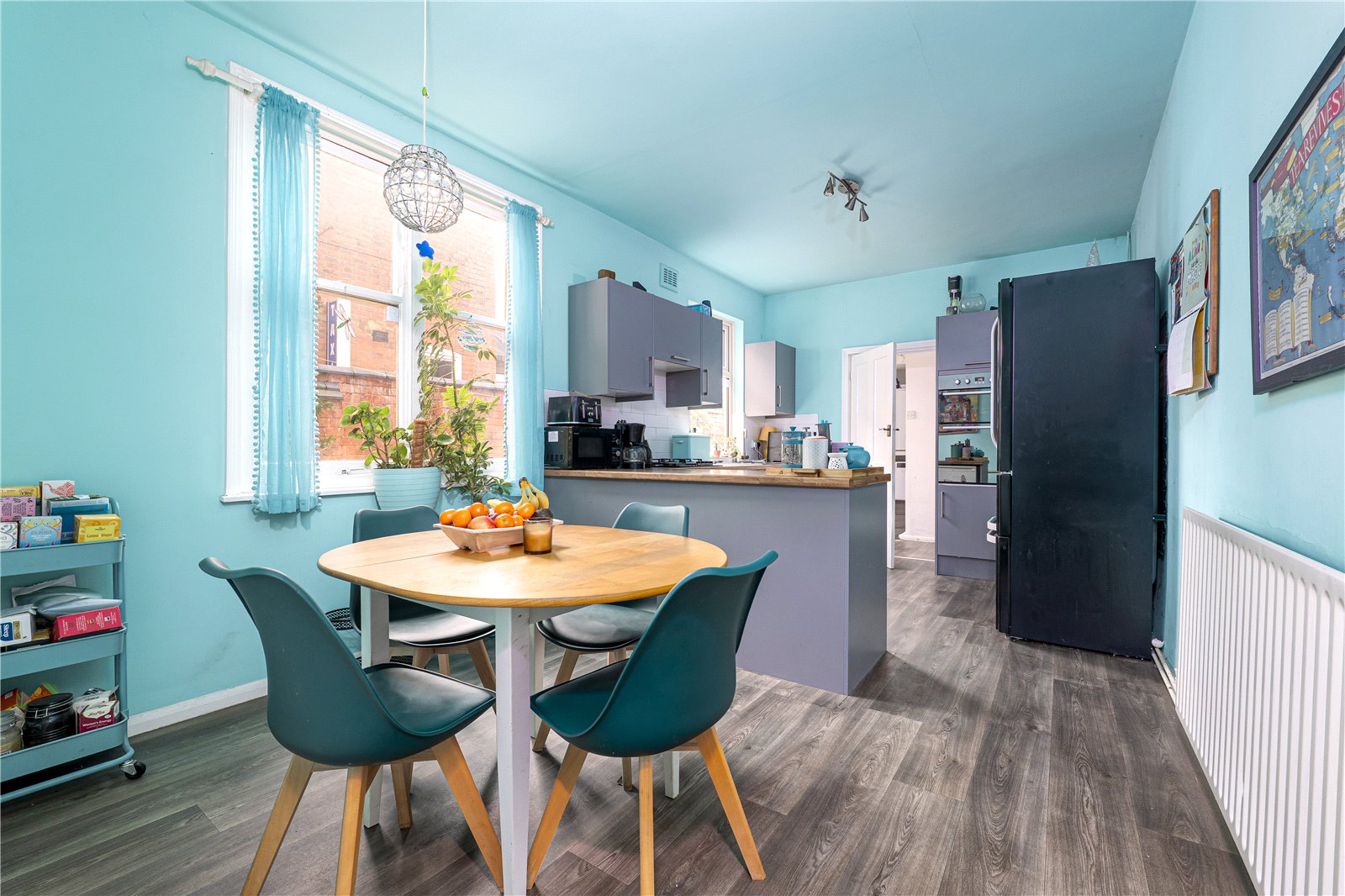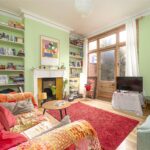 The handsome red brick façade with blue painted detailing and matching front door makes a memorable first impression. Stepping inside, the hallway sets the tone with its tall ceilings, original cornicing, and wooden floors that run through much of the ground floor. At the front, the bay fronted living room is a bright and welcoming space with large sash windows, an open fireplace, and picture rails — a lovely room for relaxing or entertaining. Behind it, the sitting room offers a more informal space, with French doors opening onto the garden and fitted shelving either side of the fireplace, giving the room a cosy and homely feel.
