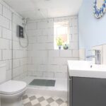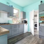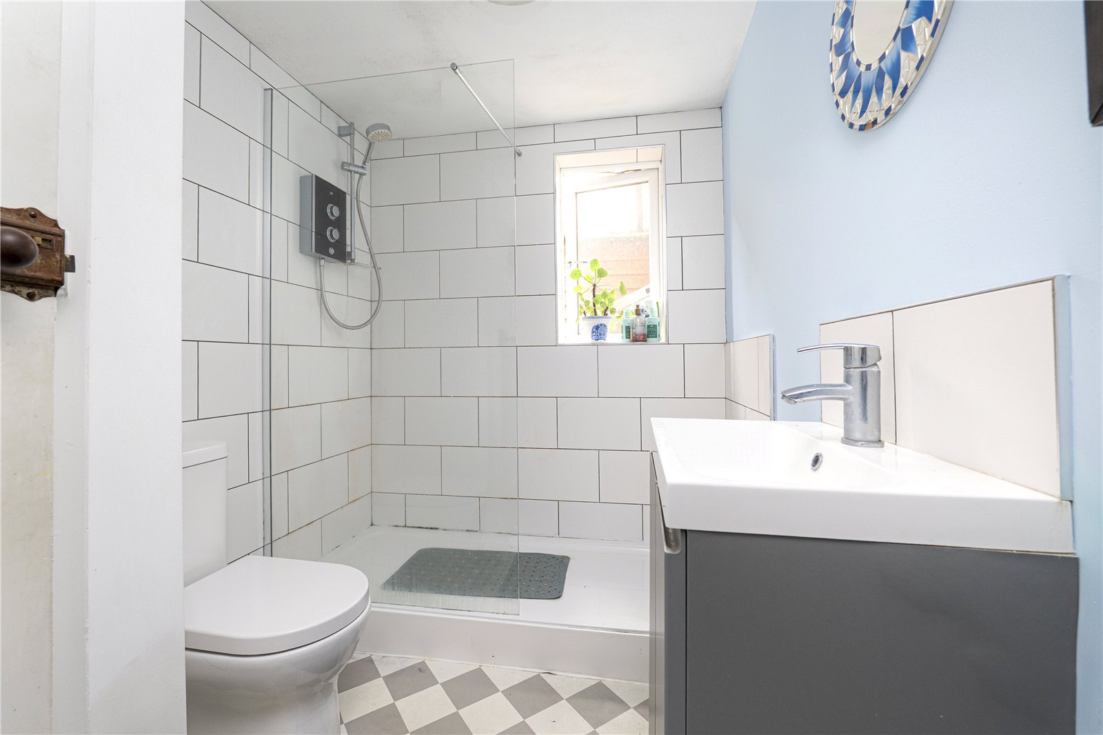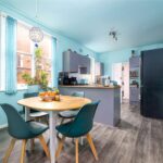 The rear of the house opens up into a spacious kitchen and dining area, the real heart of the home. Finished in cheerful tones with modern cabinetry and solid wooden worktops, it has space for a large dining table and a relaxed, social layout. Two big windows fill the room with natural light and look out to the garden. There’s also a useful pantry for storage and a contemporary shower room and WC tucked neatly at the back.