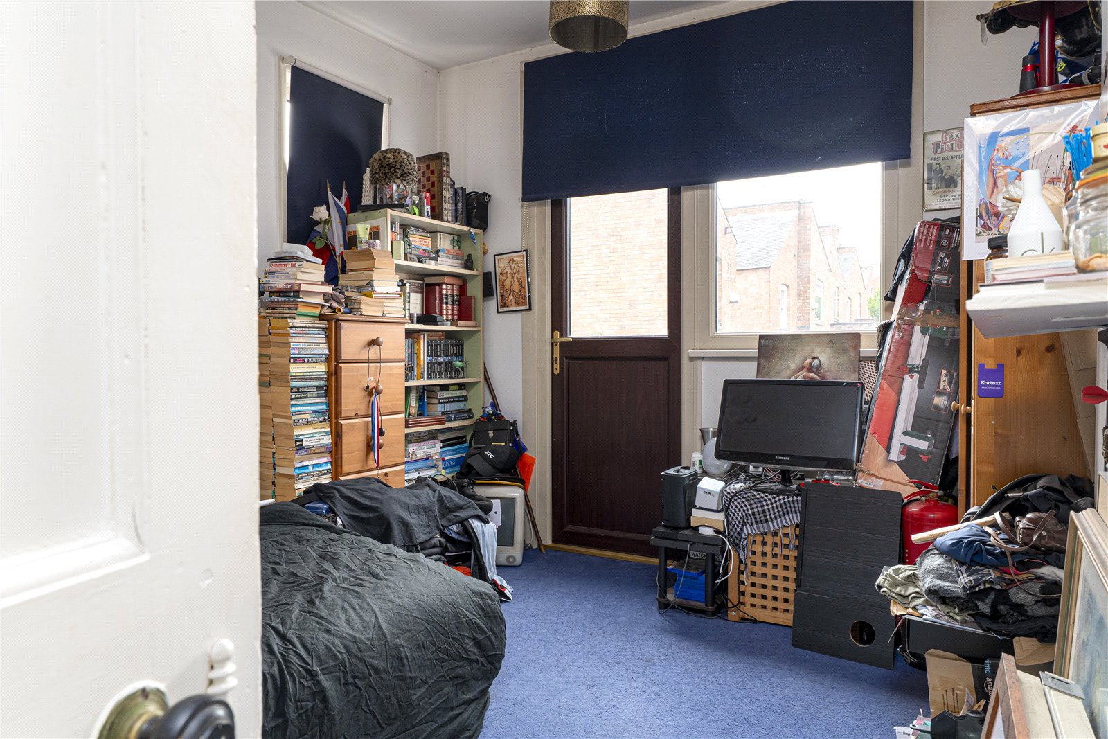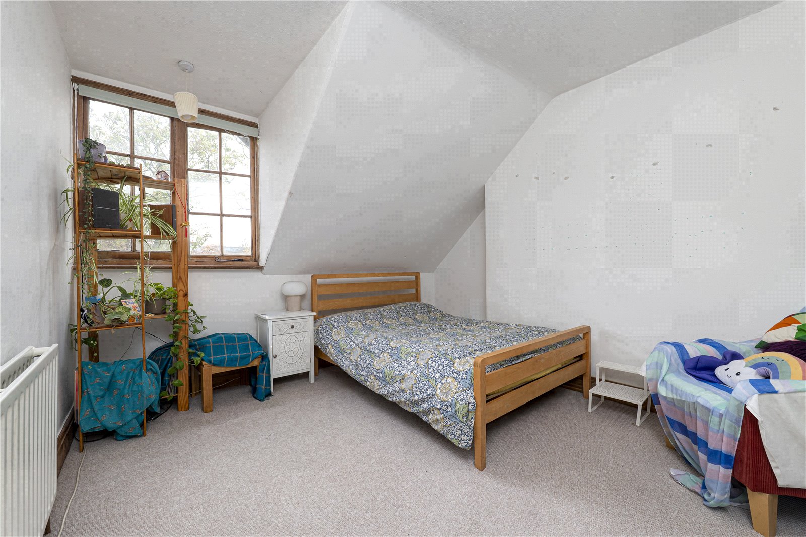 The top floor offers two further bedrooms, each with its own character. The fourth bedroom is a bright double with dormer window and painted floors, while the fifth, currently set up as a study, would work equally well as a single bedroom or creative space. There’s also a handy storeroom providing additional space for boxes, bikes or luggage.