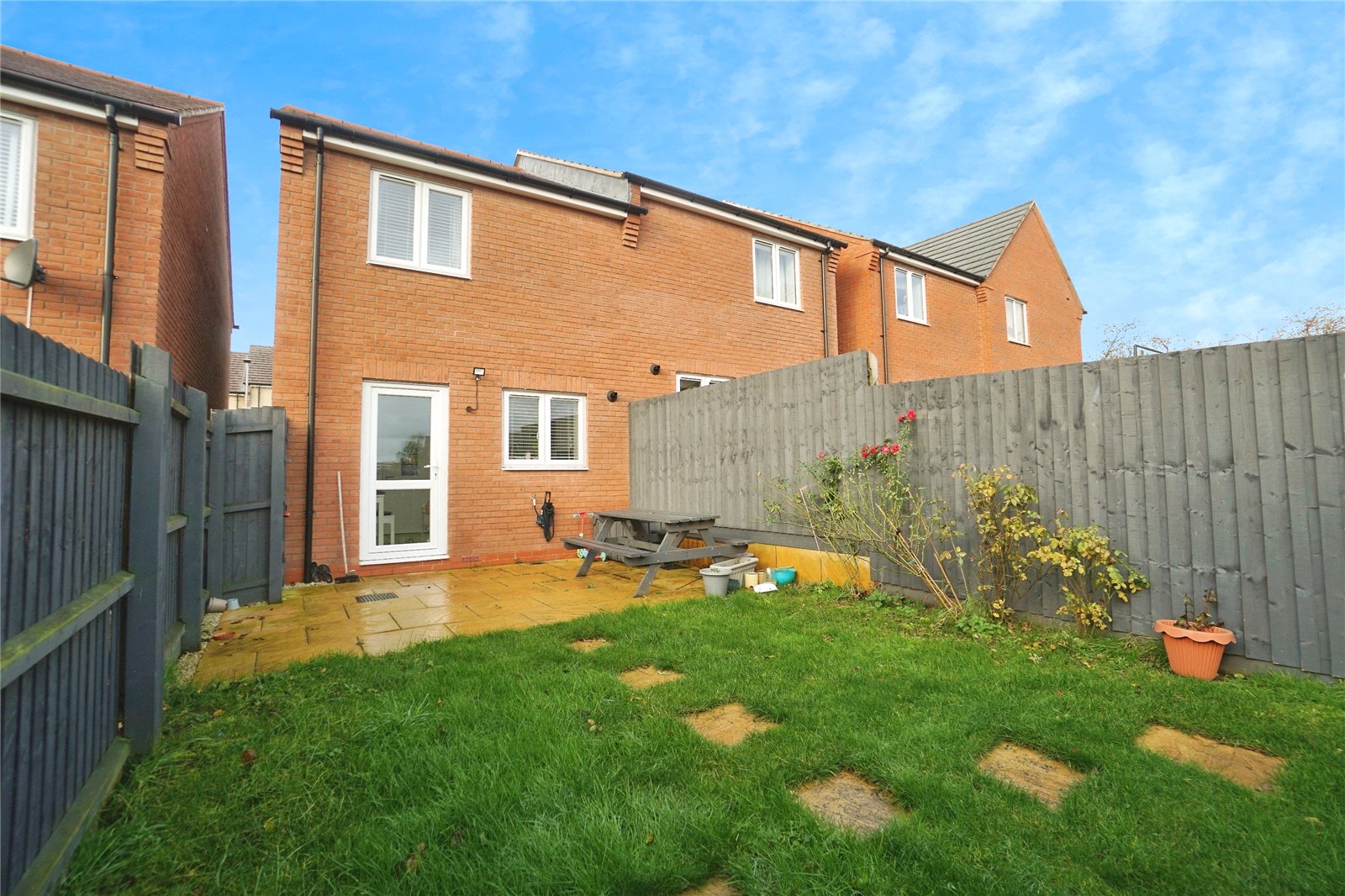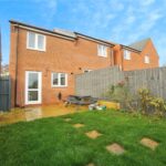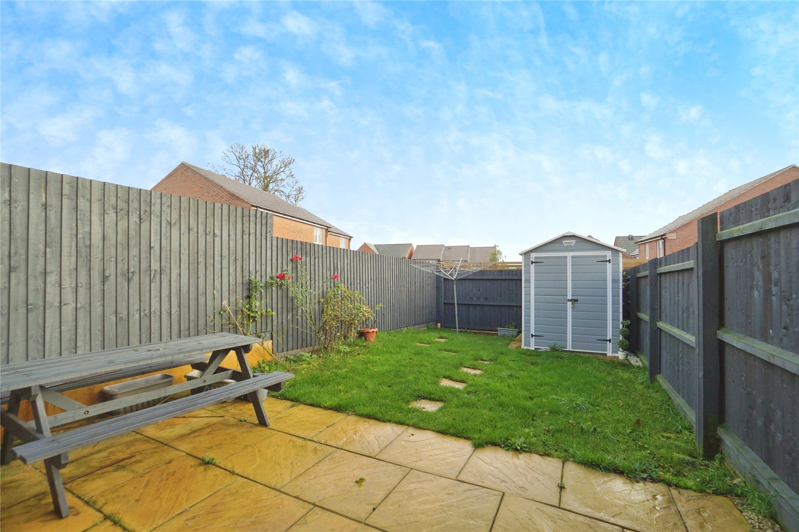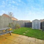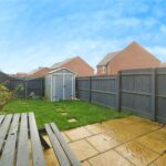 Outside, the rear garden is an impressive size for a property of this type and has been set out to offer both practicality and enjoyment. A paved patio sits directly behind the house, ideal for outdoor dining, with a central lawn extending towards the rear boundary. The garden is fully enclosed by fencing, making it secure for children and pets. A storage shed provides useful space for gardening equipment and bikes, while the flat layout keeps maintenance simple.