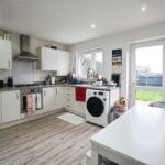 At the rear of the property lies the superb kitchen/dining room – a standout feature of the home. The kitchen is fitted with modern wall and base units, stainless steel oven and hob, extractor hood, and ample worktop space for food preparation. The room is large enough to accommodate a family dining table with ease, making it perfect for mealtimes and entertaining. French doors open directly onto the rear garden, allowing natural light to flood in and providing an effortless connection to outdoor space during warmer months. A handy under-stairs storage cupboard is accessed from this room, ideal for household essentials.