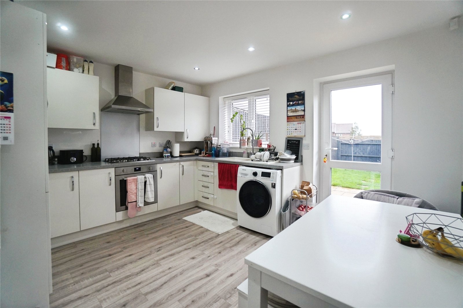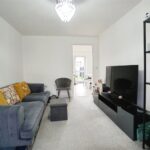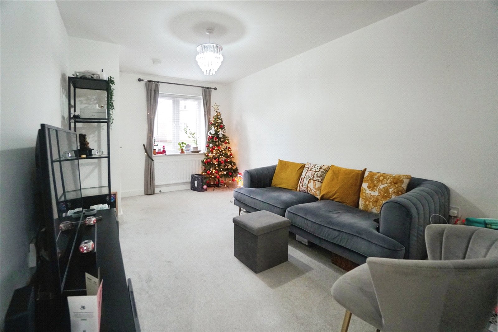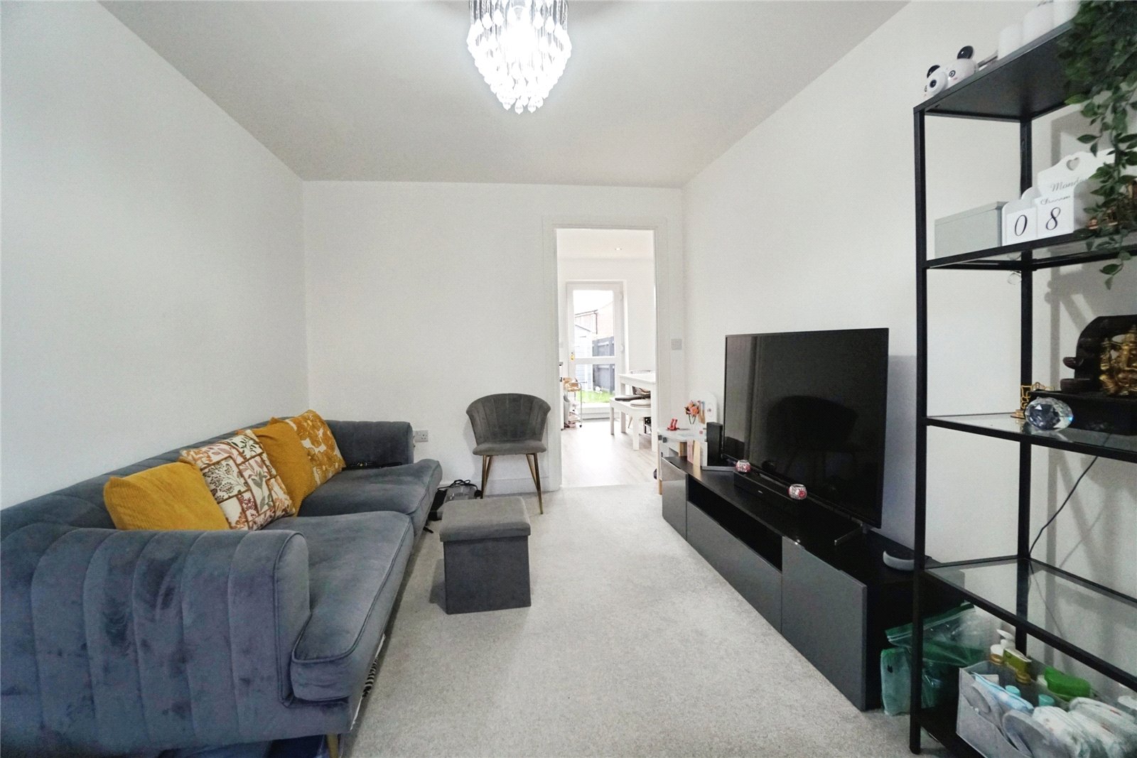 A neatly maintained frontage with tandem driveway parking leads to the entrance porch, giving the home a smart, welcoming appearance. Stepping inside, the hallway provides access straight into the main living room, a bright and comfortable space with a large front-facing window offering plenty of natural light. The room easily accommodates a sofa suite, media unit and additional furniture, creating a relaxing setting for everyday living. Neutral décor and carpeting keep the space warm and inviting, with sightlines through to the kitchen/dining room enhancing the sense of flow.