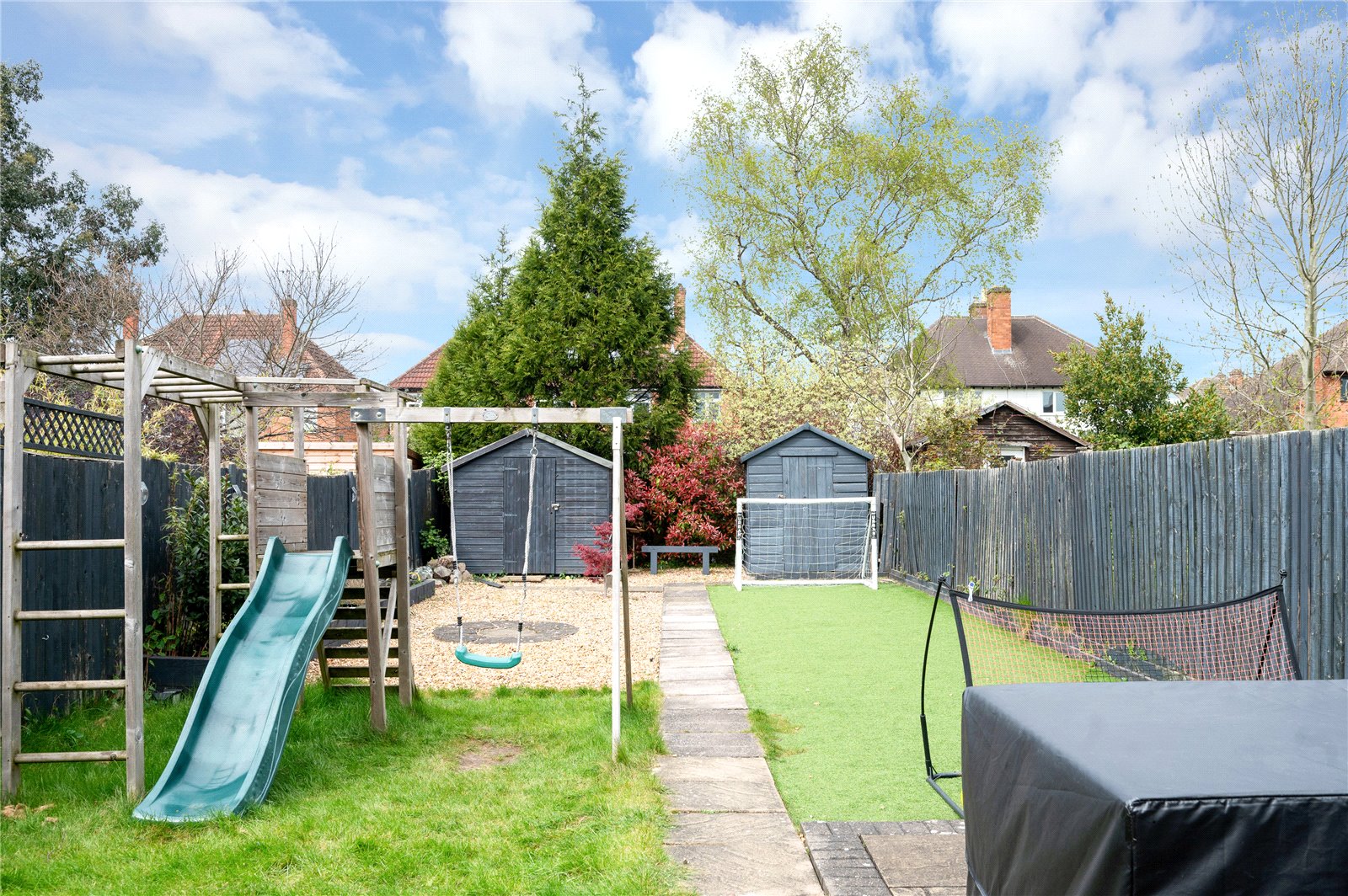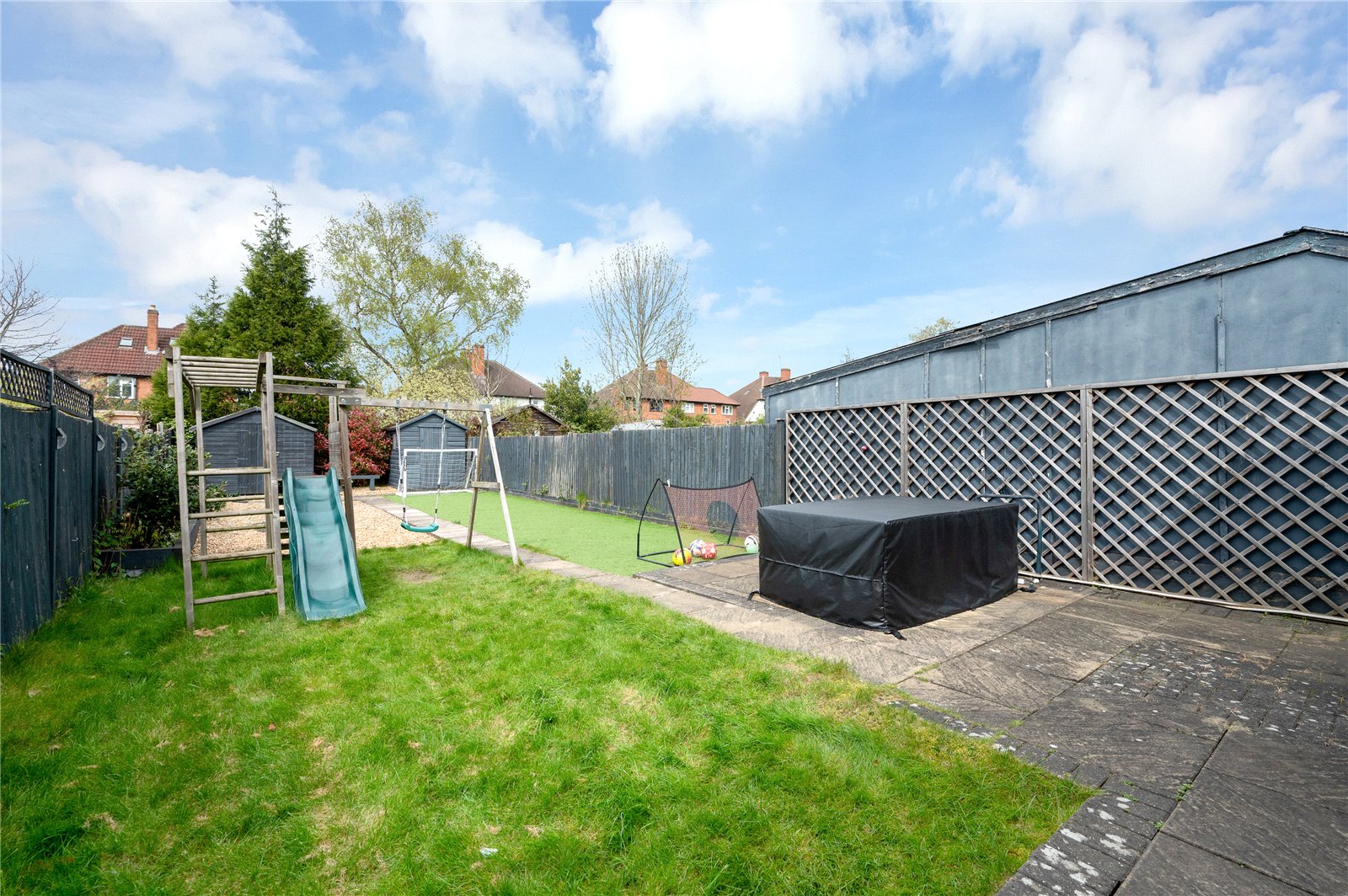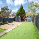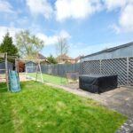 Externally, the rear garden is mainly laid to lawn with a patio seating area, enclosed by fencing and designed for ease of maintenance, offering a practical and private outdoor space.