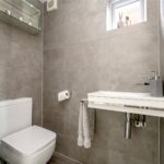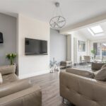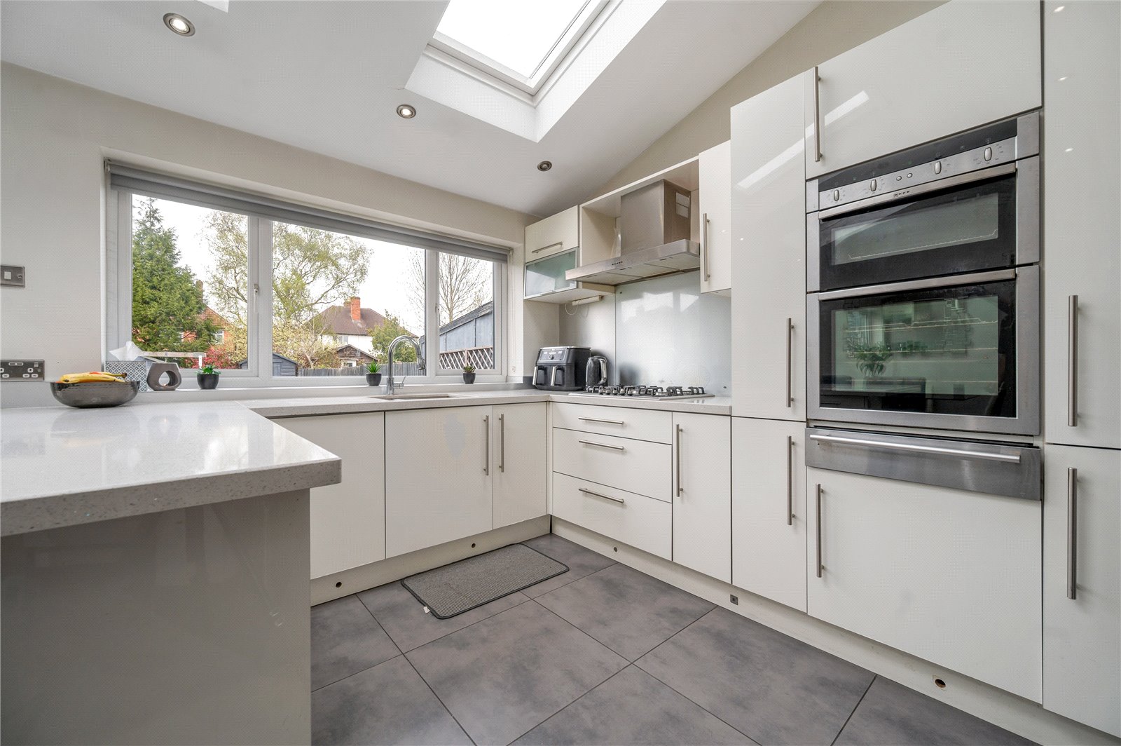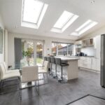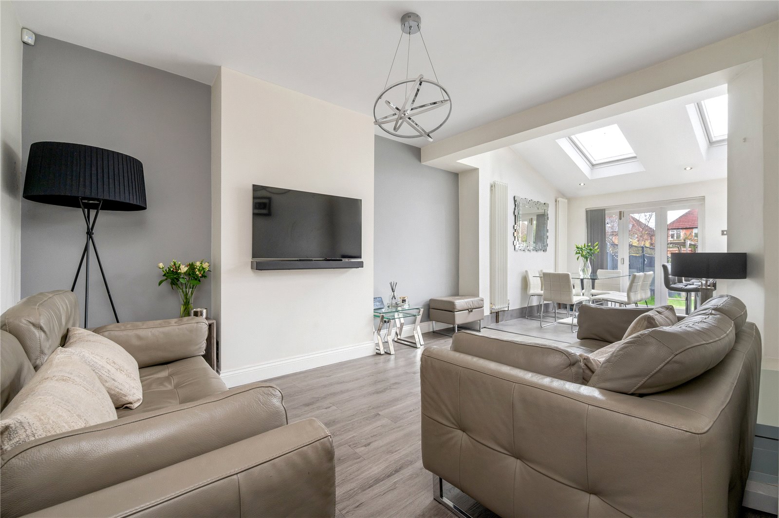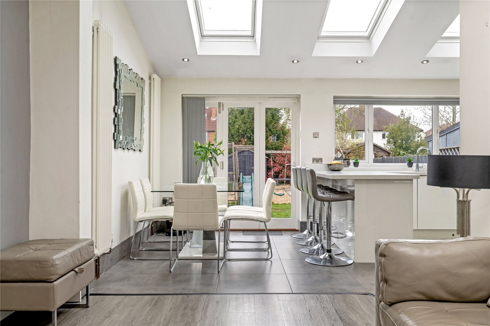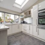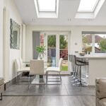 To the rear, the house opens into a striking open-plan living kitchen dining space, thoughtfully designed as the social heart of the home. This room is notably bright and airy, enhanced by overhead skylights and wide openings that allow natural light to flood in throughout the day. The layout seamlessly incorporates cooking, dining and relaxed seating areas, creating a highly versatile environment suited to both everyday living and entertaining. Large doors open directly onto the garden, reinforcing the connection between inside and out and lending a strong sense of flow, particularly during the warmer months.