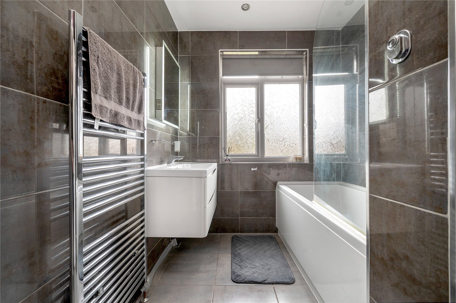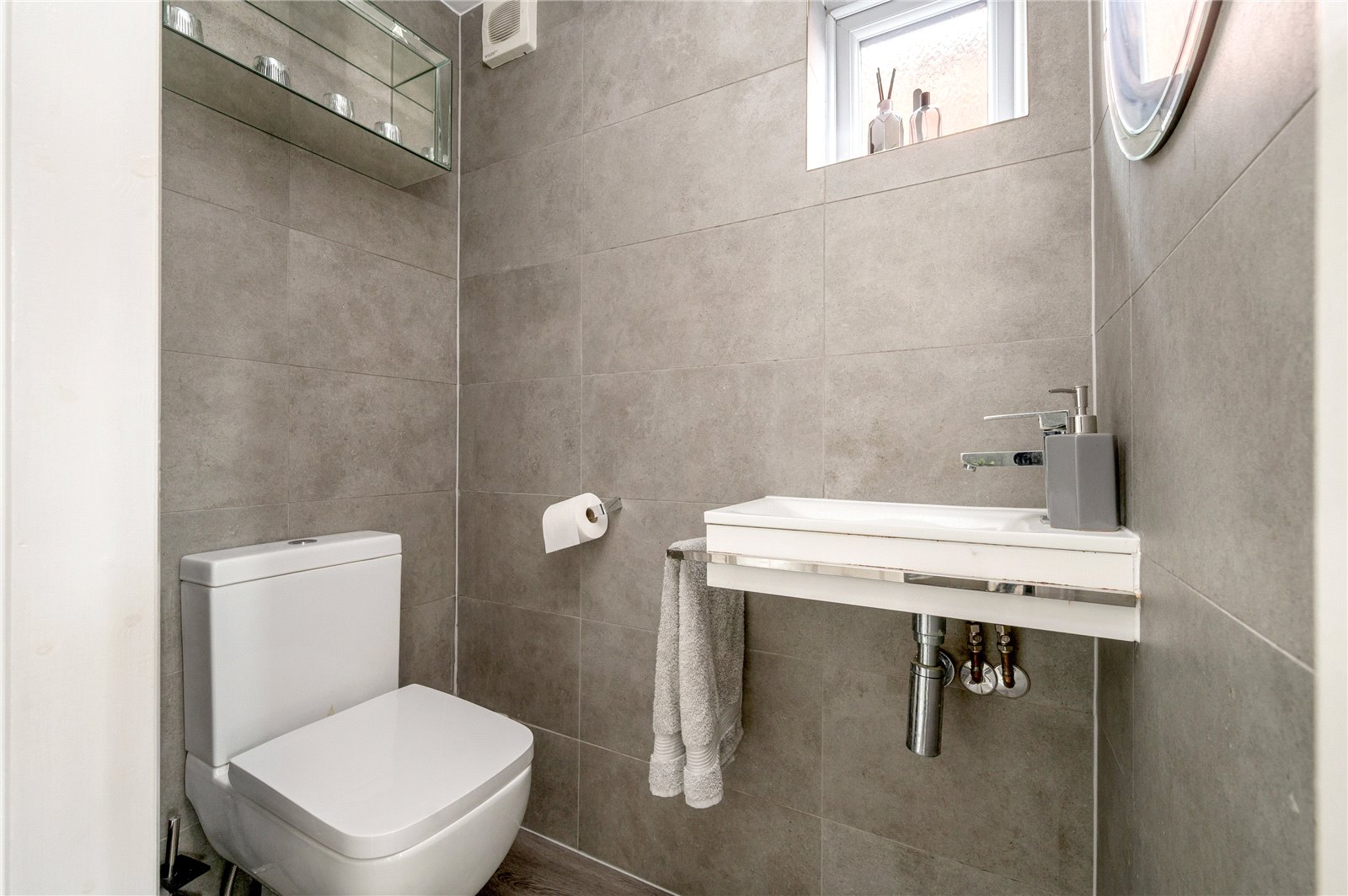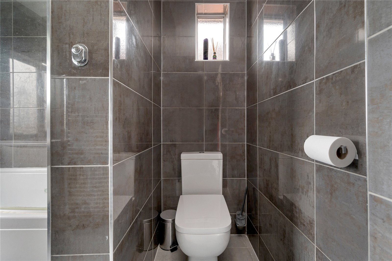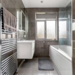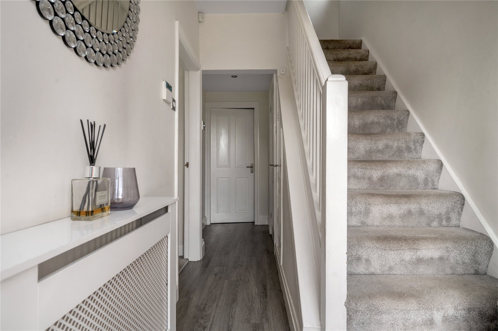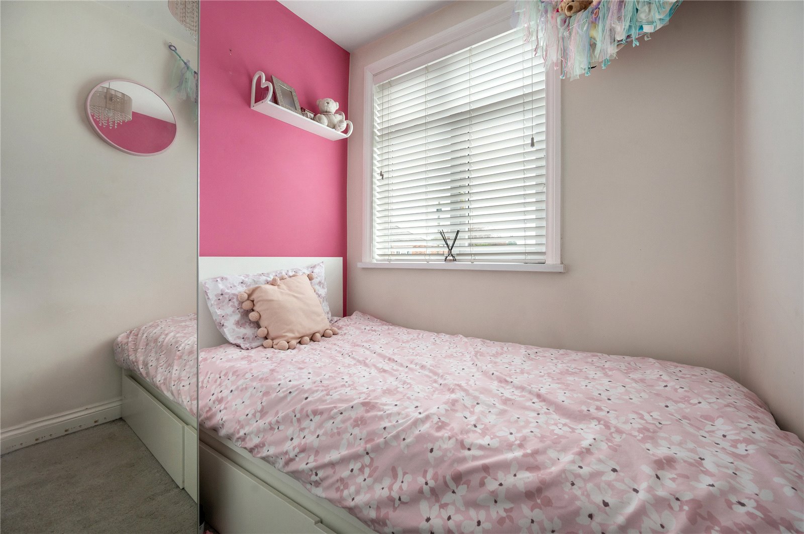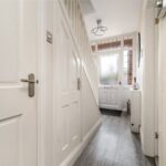 The first floor comprises three bedrooms and a bathroom with a separate WC. The principal bedroom spans the front elevation and benefits from fitted storage, while the second bedroom is a well-proportioned double overlooking the rear. A third bedroom offers flexibility as a nursery, dressing room or home office. The bathroom is traditionally arranged, featuring a bath with shower over and basin, with a separate WC located adjacent.