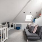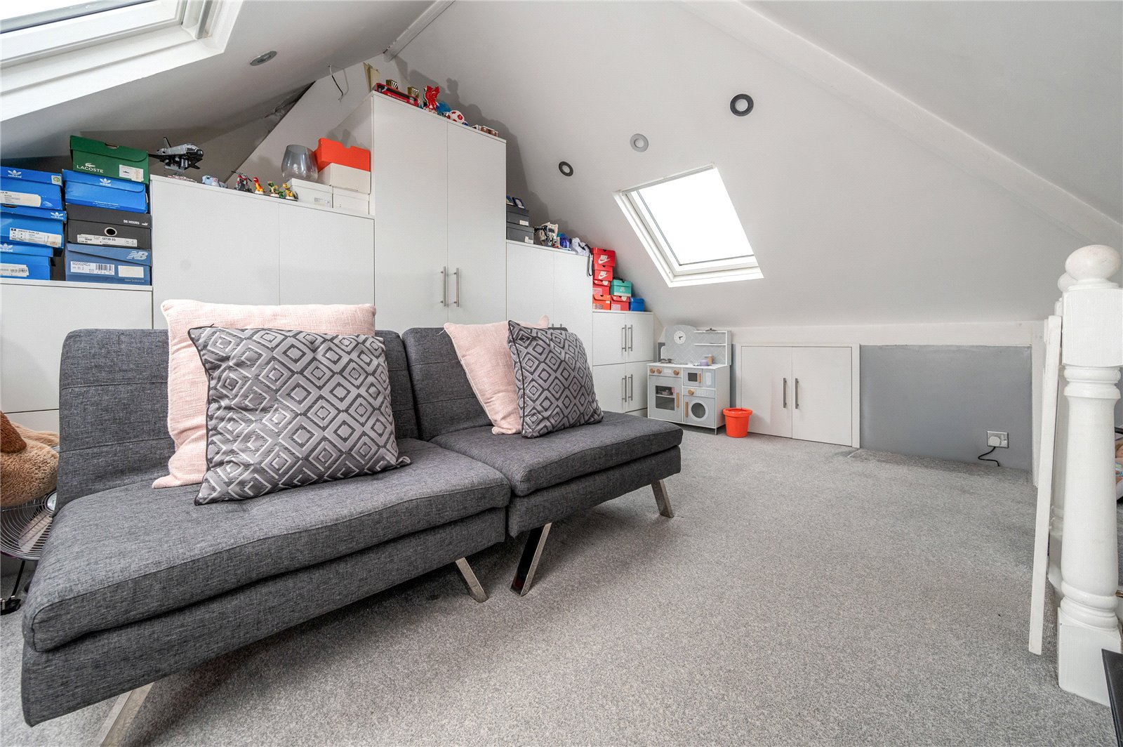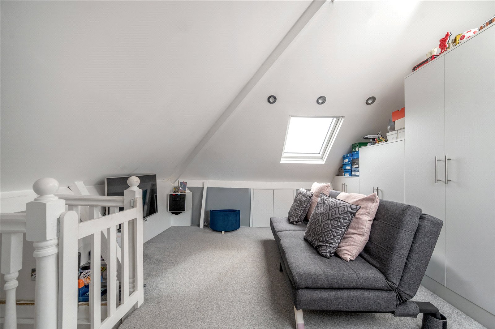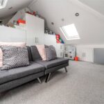 From the landing, stairs rise to a loft room, providing a generous additional space with skylights and useful eaves storage. This adaptable room lends itself to a variety of uses, whether as a bedroom, workspace or hobby area.