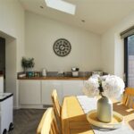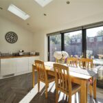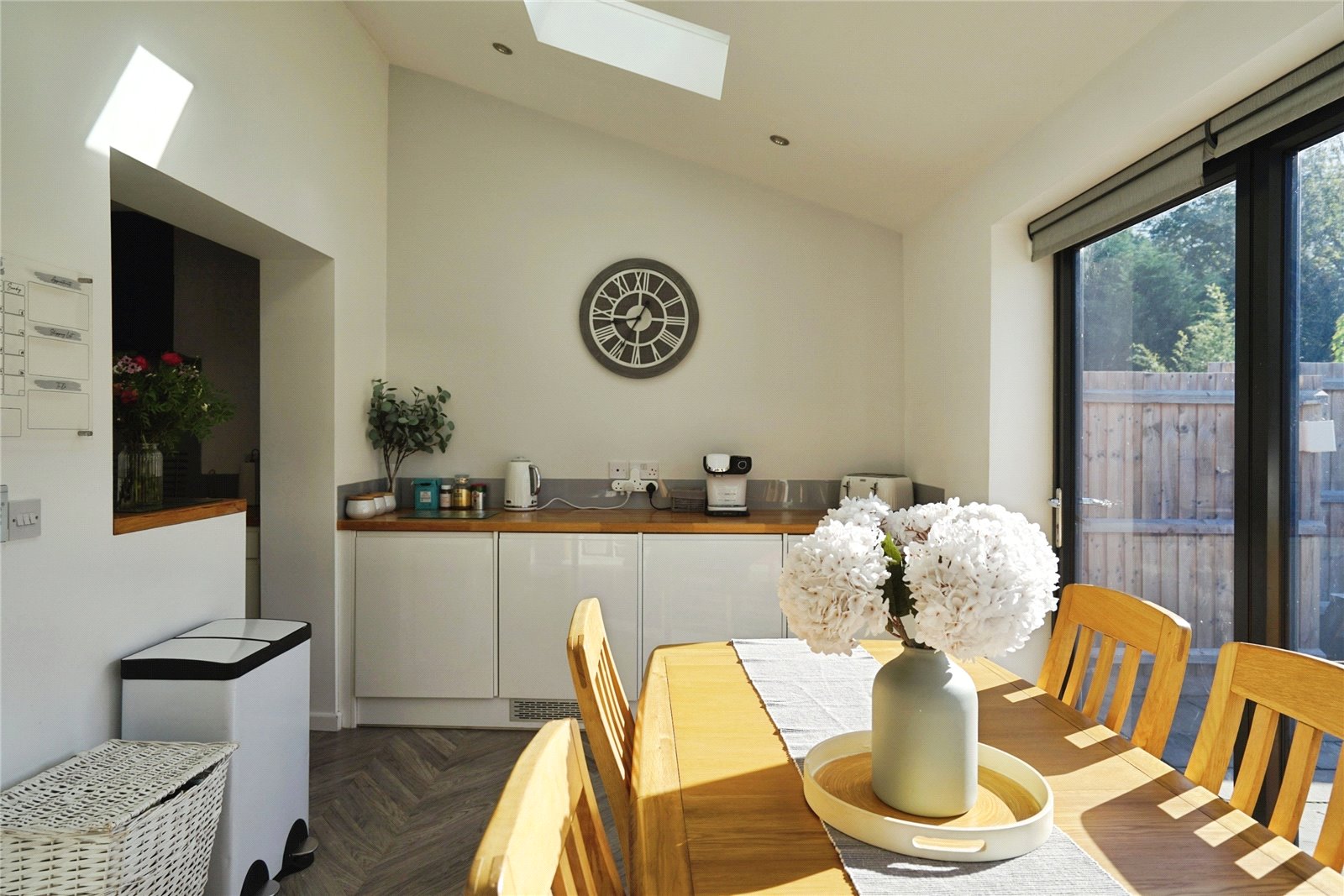 The ground floor offers a wonderful sense of space, starting with a bright and welcoming living room featuring a large bay window, contemporary flooring and tasteful décor — the perfect setting for relaxing or entertaining. The kitchen is fitted with sleek units, quality worktops and integrated appliances, designed with both practicality and style in mind. Flowing seamlessly from here, the dining room has been thoughtfully extended and is a real highlight of the home. Bathed in natural light thanks to skylights and full-width bi-fold doors, it creates a versatile space ideal for family meals or hosting, while offering direct access to the beautifully landscaped rear garden.